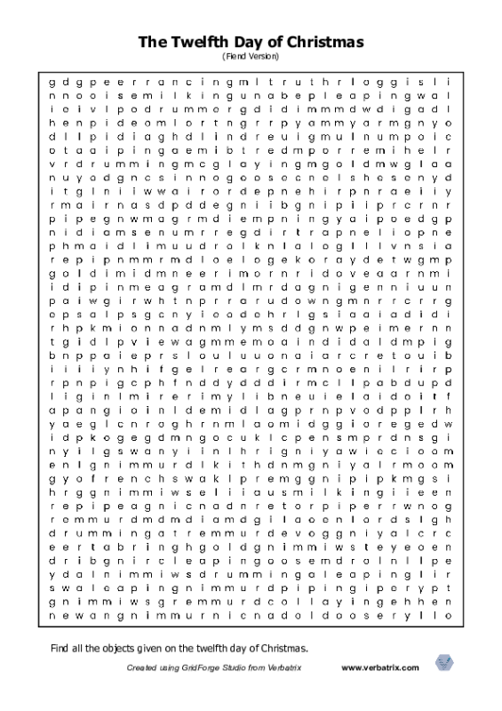 This one will keep you going for a long time ... find all the objects given on the twelfth day of Christmas. In the grid you will find 'French' 'hen' x 3, 'gold' 'ring' x 5 etc. In this version all the words are placed either left to right, down or diagonally forwards (up or down).